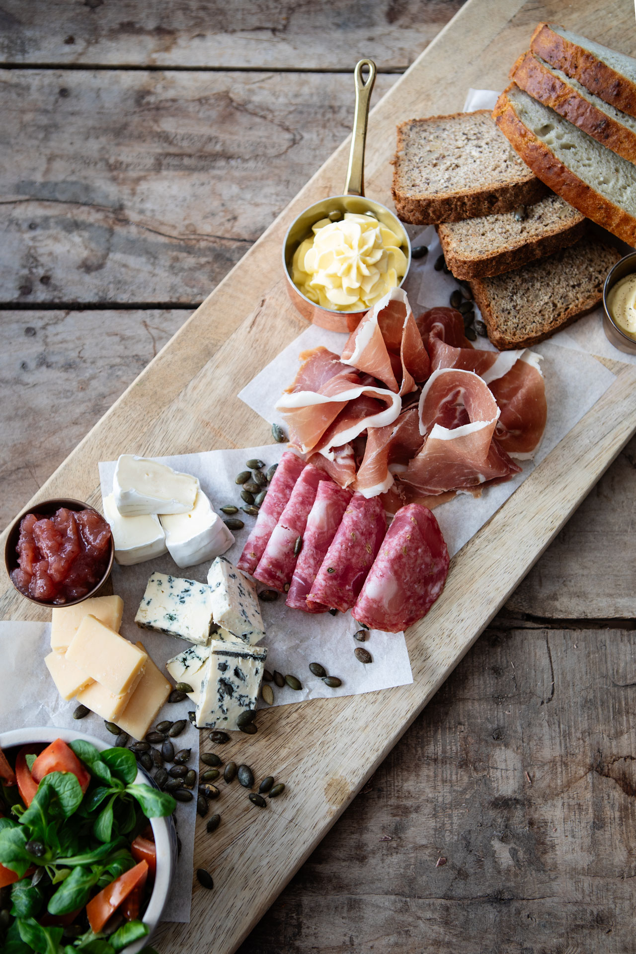 Nyt hjemmelagde brød, pisket smør, aioli, syltede grønnsaker, saltristete gresskarkjerner, norske oster, lokal spekemat og sjokoladefudge. Drikke kommer i tillegg.